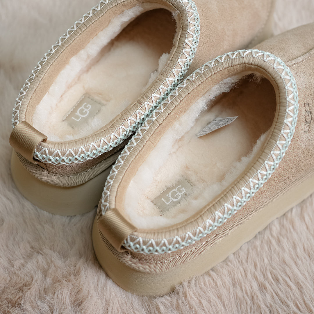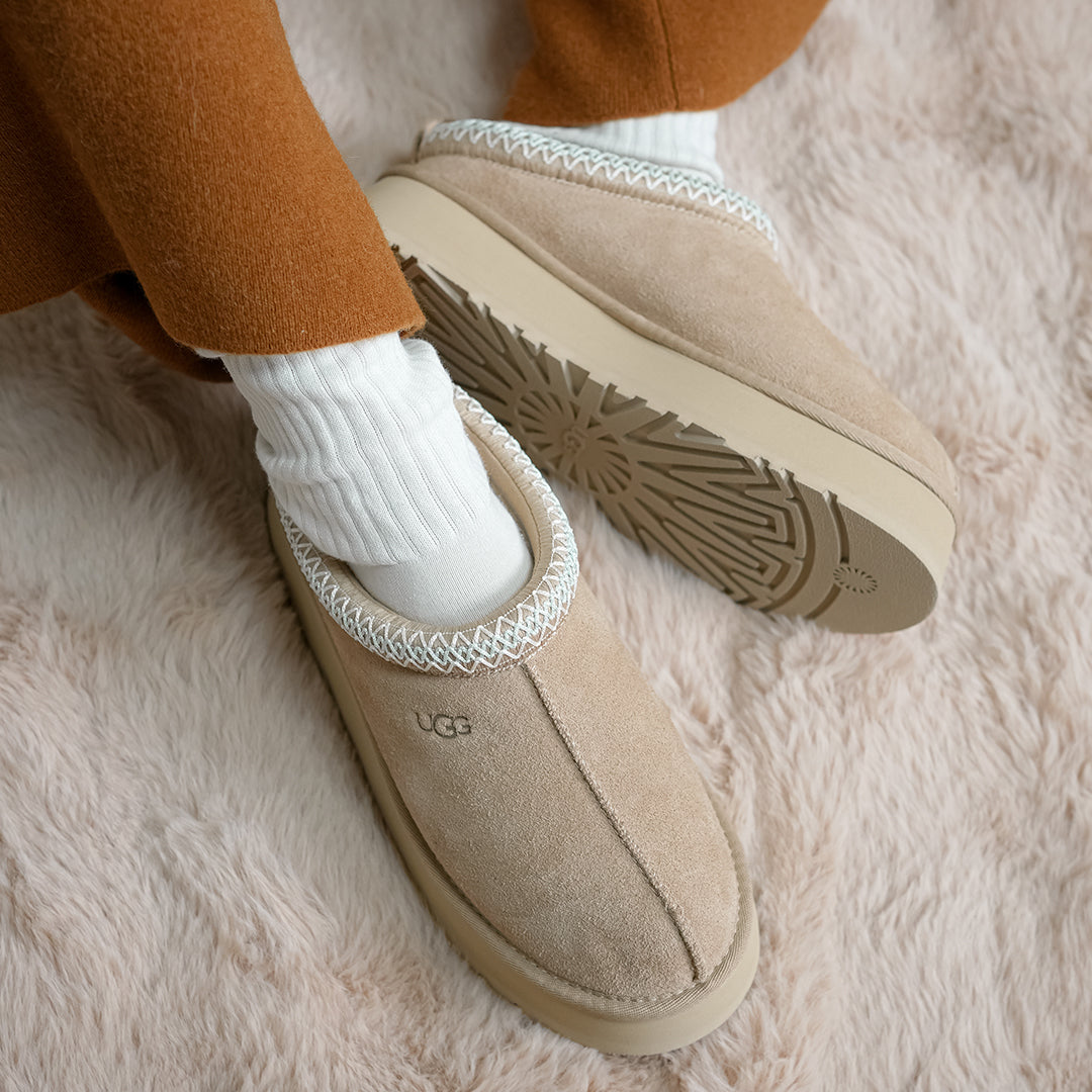 The Women's UGG Tazz Slipper II 'Sand' comfortable chunky-soled slippers feature a soft suede sheepskin lining and lightweight rocker sole, delivering all-day comfort whether indoors or out.